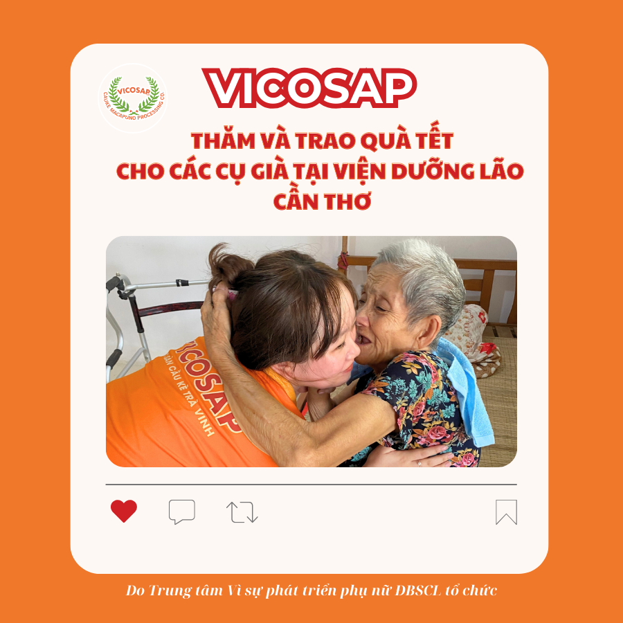 Trưa ngày 02/02/2024, Vicosap đồng hành cùng Trung tâm Vì sự phát triển phụ nữ ĐBSCL đến thăm và trao quà Tết cho các cụ già tại viện dưỡng lão Cần Thơ.
